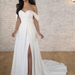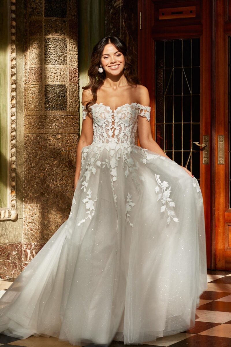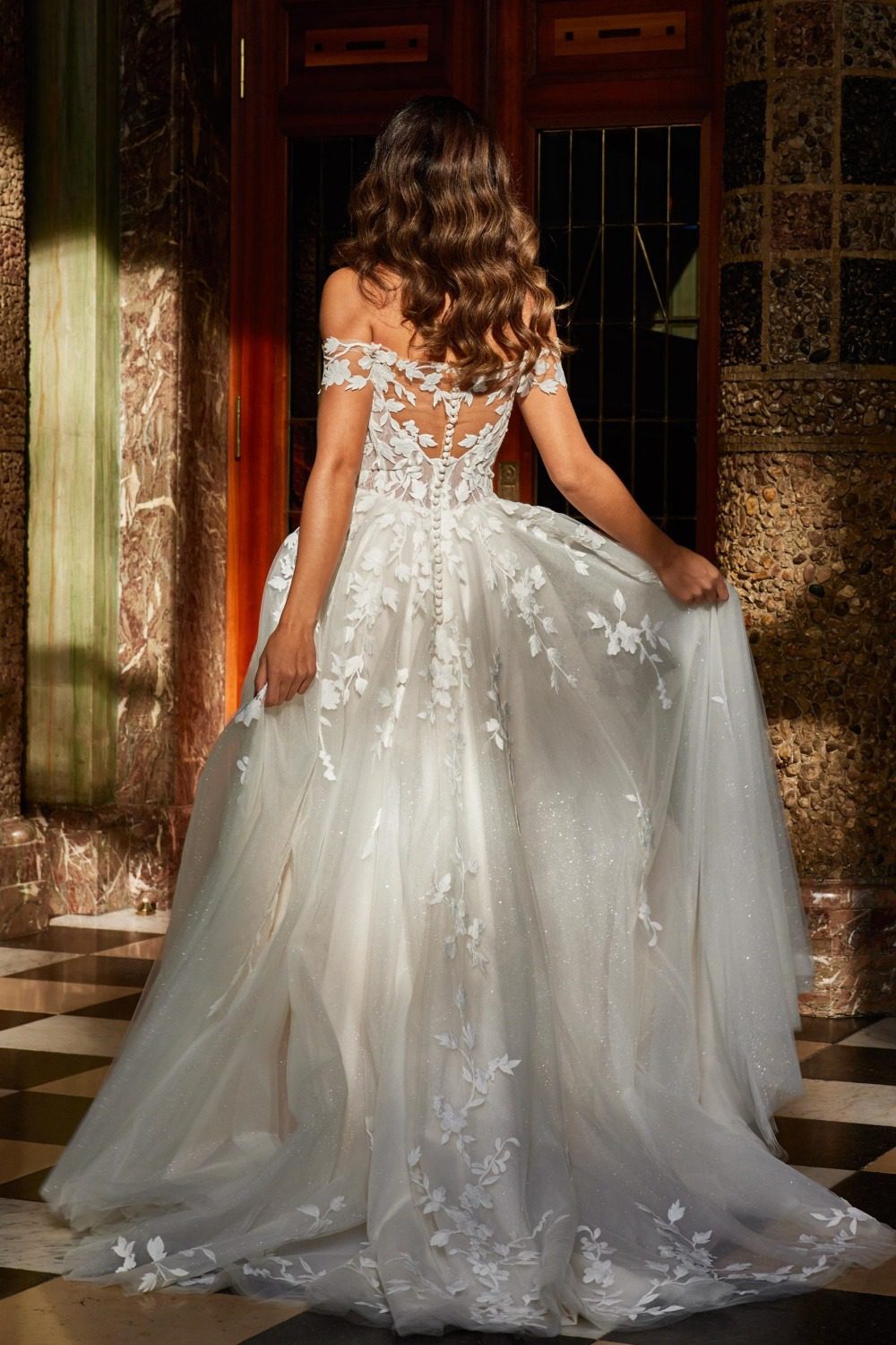 Trouwjurk 50810 van het merk Diane legrand. Deze trouwjurk heeft een hartvormige halslijn, off-shoulder mouwen, botanisch kant en laagjes tule. De semi-transparante kanten achterkant is absoluut flatterend.