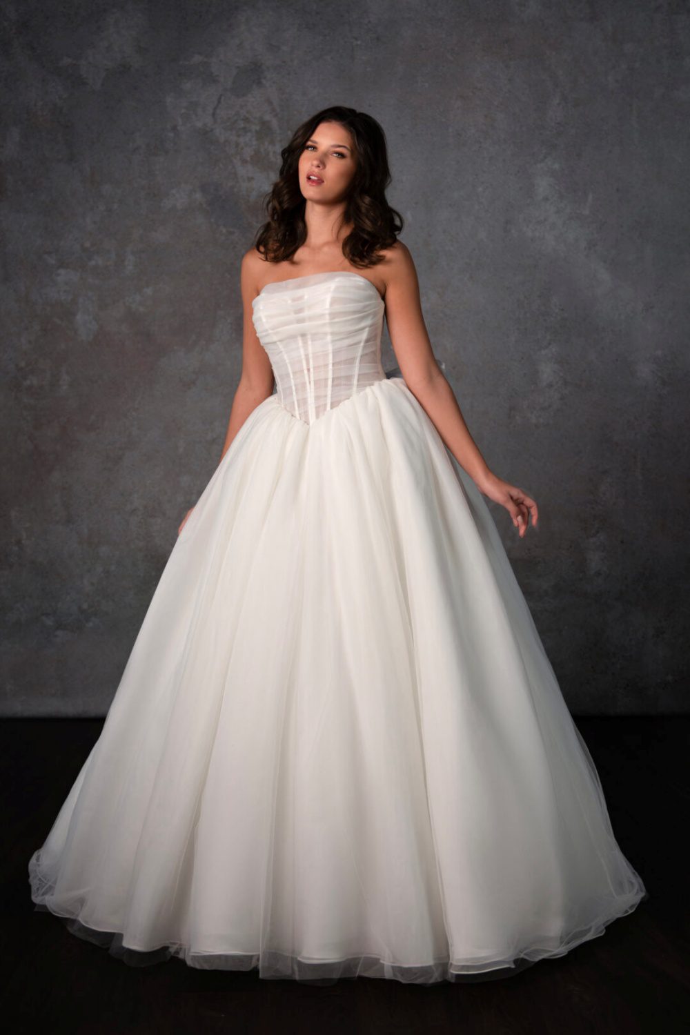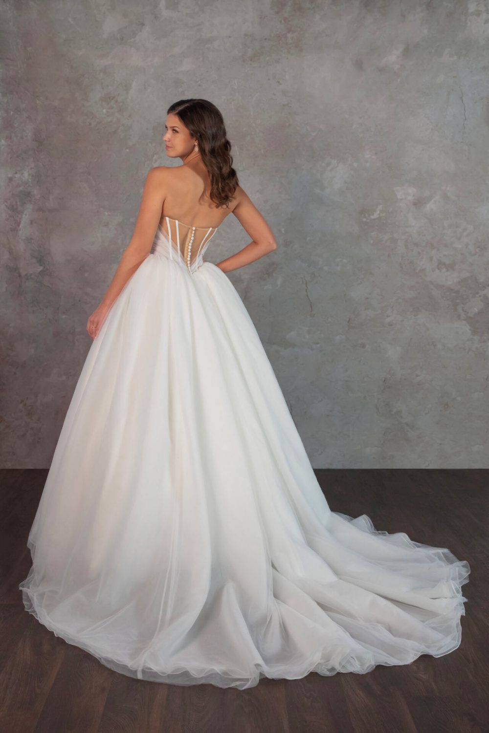 Trouwjurk D4322 van het merk Essense Of Australia. Een baljurk van zachte tule met een geplooid lijfje en wijde rok. De strapless top is semi-transparant en voorzien van een prachtig rug accent met knoopjes en sierlijke strik.