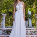 Trouwjurk DR250 van het merk Destination Romance. Deze jurk bestaat uit een gedetailleerde top van kant en een rustige rok van crepe stof. Het doorzichtige lijfje is voorzien van een V-hals met schouderbanden en een opvallende illusion rug.