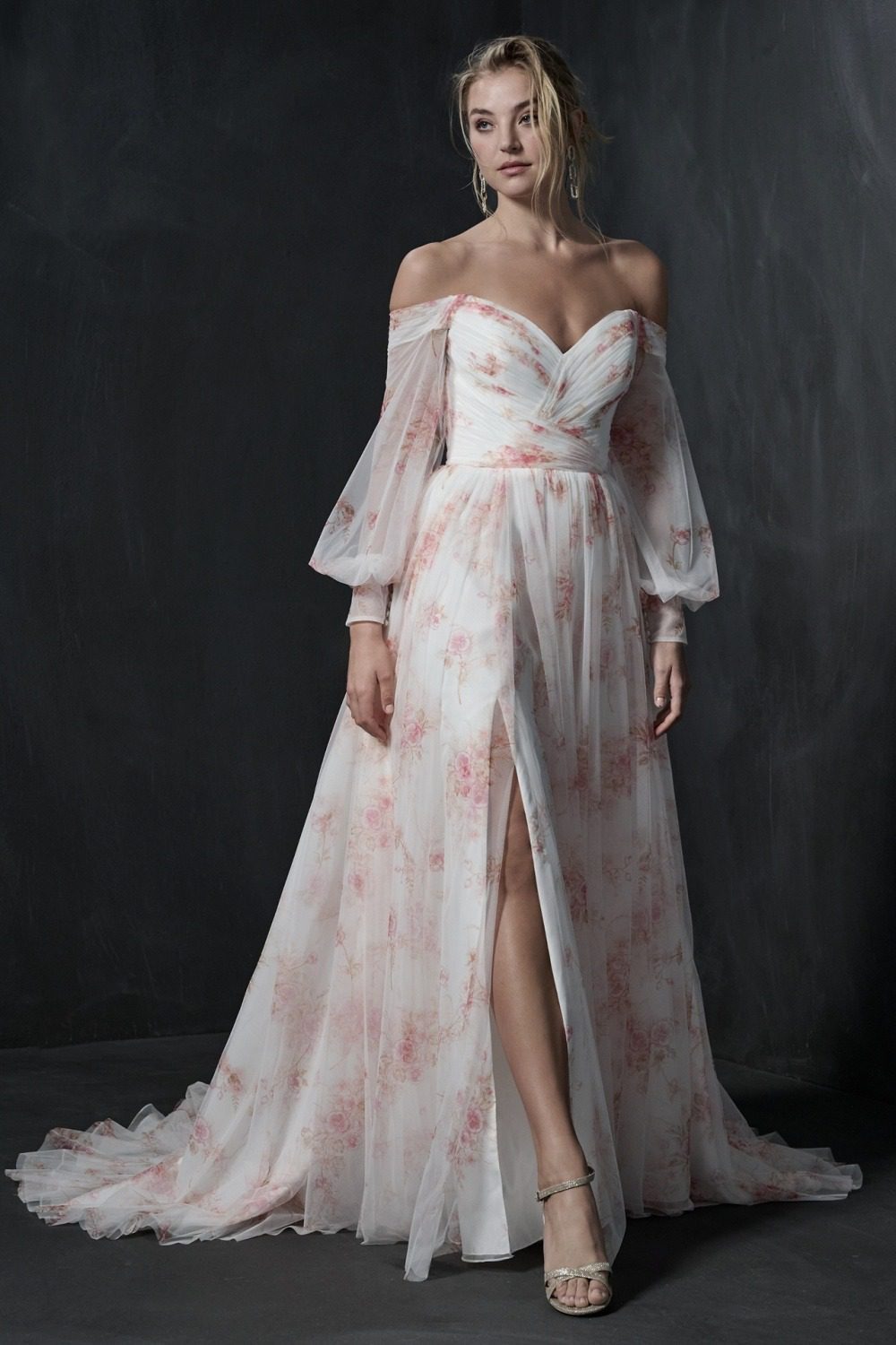 Trouwjurk NERIDA van het merk Sottero and Midgley. Ga voor een unieke look met deze romantische jurk met flowy rok en stoere split. Het sweetheart lijfje heeft off-the-shoulder lange mouwen en de lage rug sluit met knoopjes.
