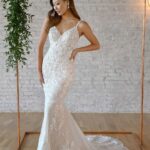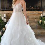 Trouwjurk OLENA Victoria & Vincent. Deze jurk heeft een rok van zachte tule en top met chique lange mouwen. De V-hals is aan de voor- en achterzijde prachtig afgewerkt met modern kant.